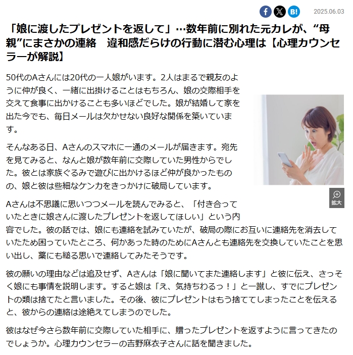 Aさんは不思議に思いつつメールを読んでみると、「付き合っていたときに娘さんに渡したプレゼントを返してほしい」という内容でした。彼の話では、娘にも連絡を試みていたが、破局の際にお互いに連絡先を消去していたため困っていたところ、何かあった時のためにAさんとも連絡先を交換していたことを思い出し、藁にも縋る思いで連絡してみたそうです。