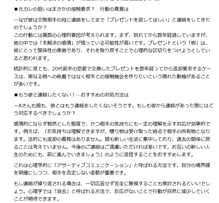 統計的に見ても、20代前半の恋愛で交換したプレゼントを数年経ってから返却要求するケースは、単なる物への執着ではなく相手との接触機会を作りたいという隠れた動機があることが多いです。