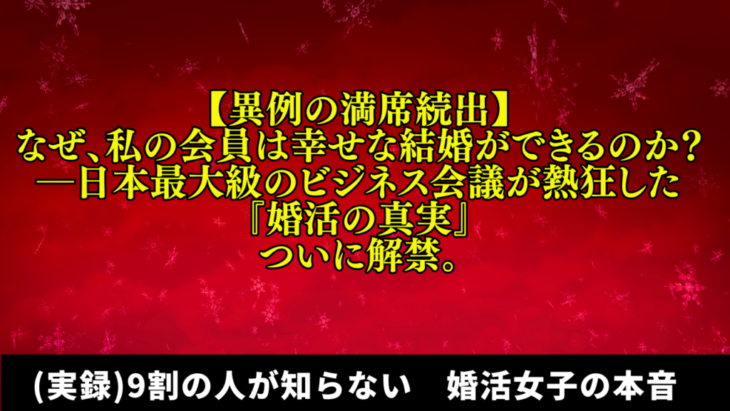 【異例の満席続出】なぜ、私の会員は幸せな結婚ができるのか?―日本最大級のビジネス会議が熱狂した『婚活の真実』、ついに解禁。