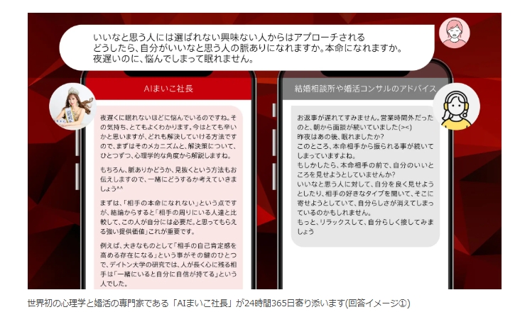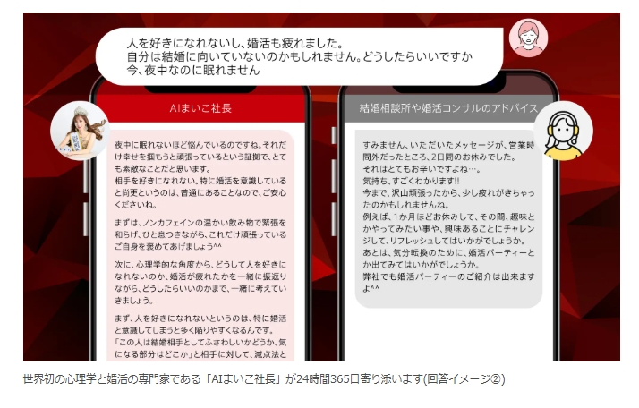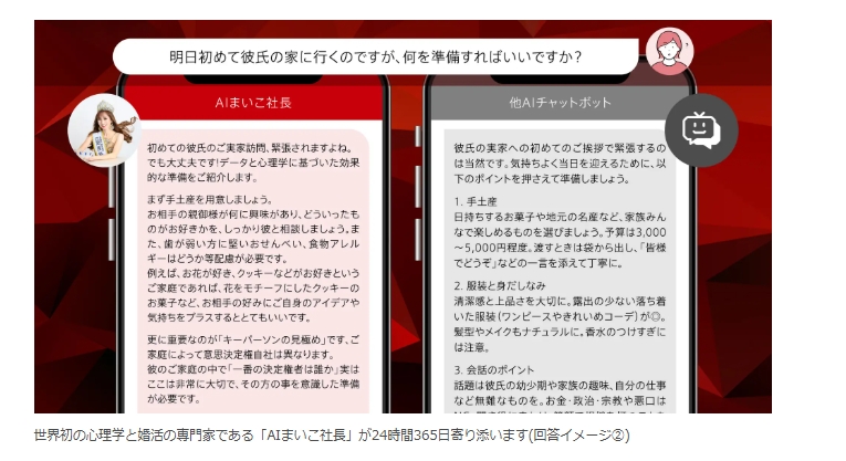 株式会社SMART BRIDAL(本社:東京都中央区・千葉県柏市、代表取締役:吉野 麻衣子)は、ミセスコンテスト世界大会で日本人初優勝を果たした恋愛婚活のプロ、心理学の専門家である代表の脳内思考を完全再現した、世界初※となるAI婚活パートナー「AI婚活心理学者」(別名・AIまいこ社長)を本日リリースしたことをお知らせいたします。