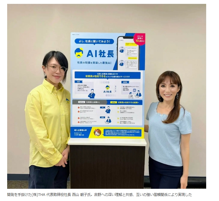 「日本を支える勇者たちに最強の強化魔法を」というビジョンのもと、企業のAI活用を推進する株式会社THA(本社:東京都新宿区、代表取締役:西山 朝子)が技術開発を担当。経営者の思考やナレッジをAI化し組織の自走を促す「AI社長」サービスで多くの企業の生産性向上を支援。